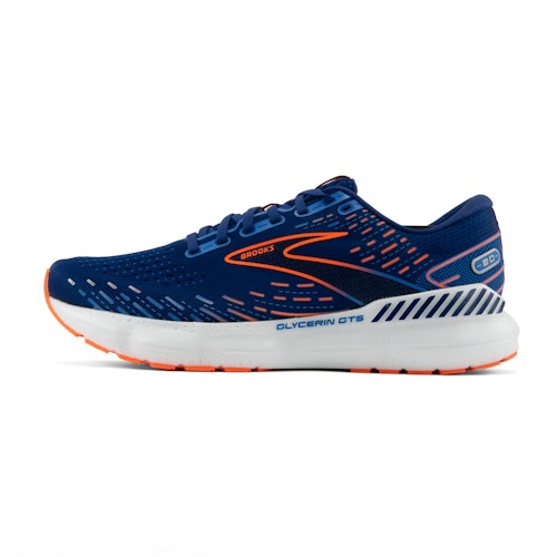 De Brooks Glycerin GTS 20 (Wide) voor heren is een allround hardloopschoen voor overpronerende lopers. De uiterst zachte Glycerin GTS 20 is ontworpen om comfort en super zachte demping te leveren tijdens het hardlopen. Het nieuwe pluche en ademende ontworpen bovenwerk van air-mesh biedt een goede pasvorm, die de voet comfortabel op zijn plaats houdt. Op strategische plaatsen is het bovenwerk versterkt voor meer structuur en gerichte ondersteuning. Op ander plaatsen is het bovenwerk flexibeler voor meer bewegingsvrijheid.