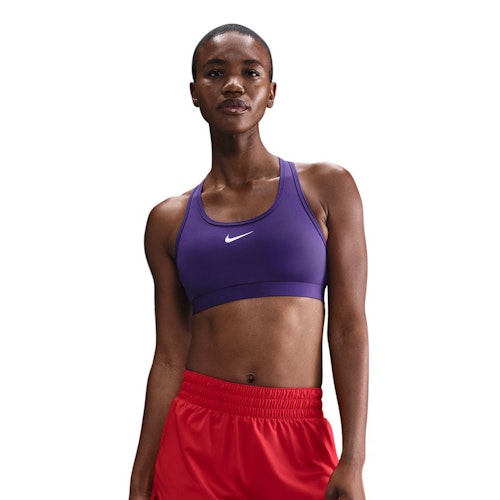 • Deze sport-bh biedt medium support en is gemaakt voor sportactiviteit als yoga, pilates en stretching. De bh kan bij rustige hardlooprondes gedragen worden wanneer je een kleine cupmaat hebt, bij intensievere hardloopsessies of wanneer je geen kleine cupmaat hebt, is een high-impact bh aan te raden De Nike Swoosh Dri-FIT Medium Support Padded Sports Bra zorgt voor fijne ondersteuning zonder een opgesloten gevoel. Concentreer je op je training zonder afgeleid te worden door overmatig zweet. De Nike Dri-FIT technologie voert overtollig zweet effectief af voor het behoud van een droge huid.